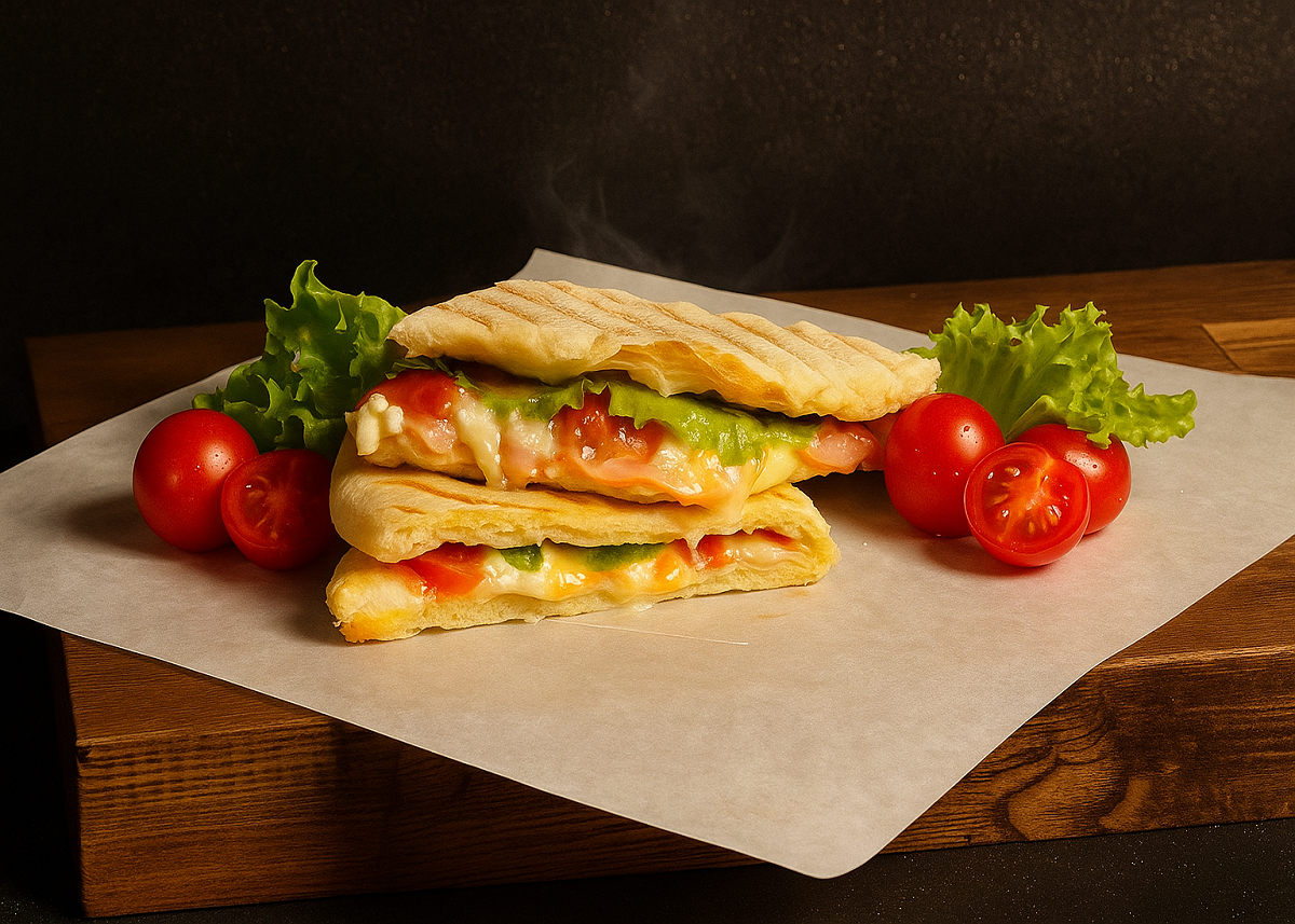 Тесто, ветчина, сыр Моцарелла, салат Айсберг, помидорки, соус Ранч