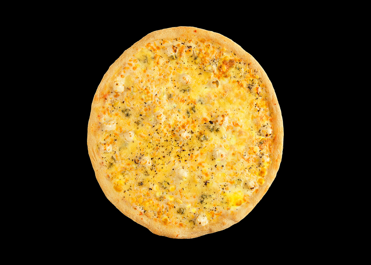 Пицца с четырьмя видами сыра. Сыры тянутся тонкими нитями, которые создают гармоничную композицию. Моцарелла отвечает за тягучесть, пармезан добавляет остроты, дорблю — пикантности, а фета придаёт нежность. Ароматный соус ранч идеально дополняет это сырное разнообразие (33см)