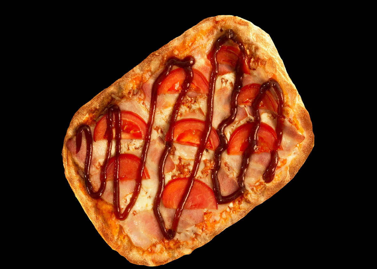 Дон Бекон — сытная пицца на римском тесте для ценителей мясных блюд. Тесто 20*25см, соус томатный, сыр Моцарелла, бекон, помидоры, соус Барбекю, базилик