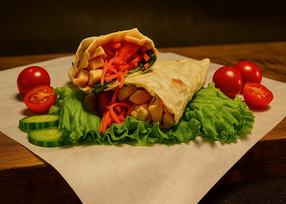 Лаваш, курочка, салат Айсберг, морковка по-корейски, помидоры, огурцы свежие, соус для шавермы